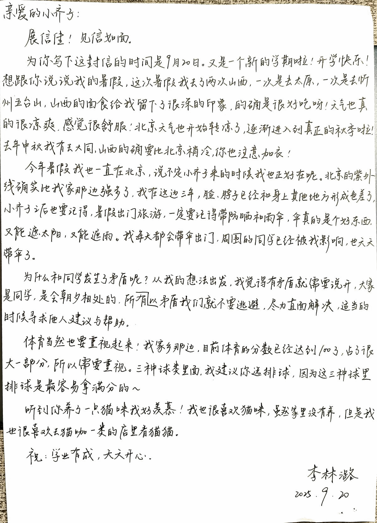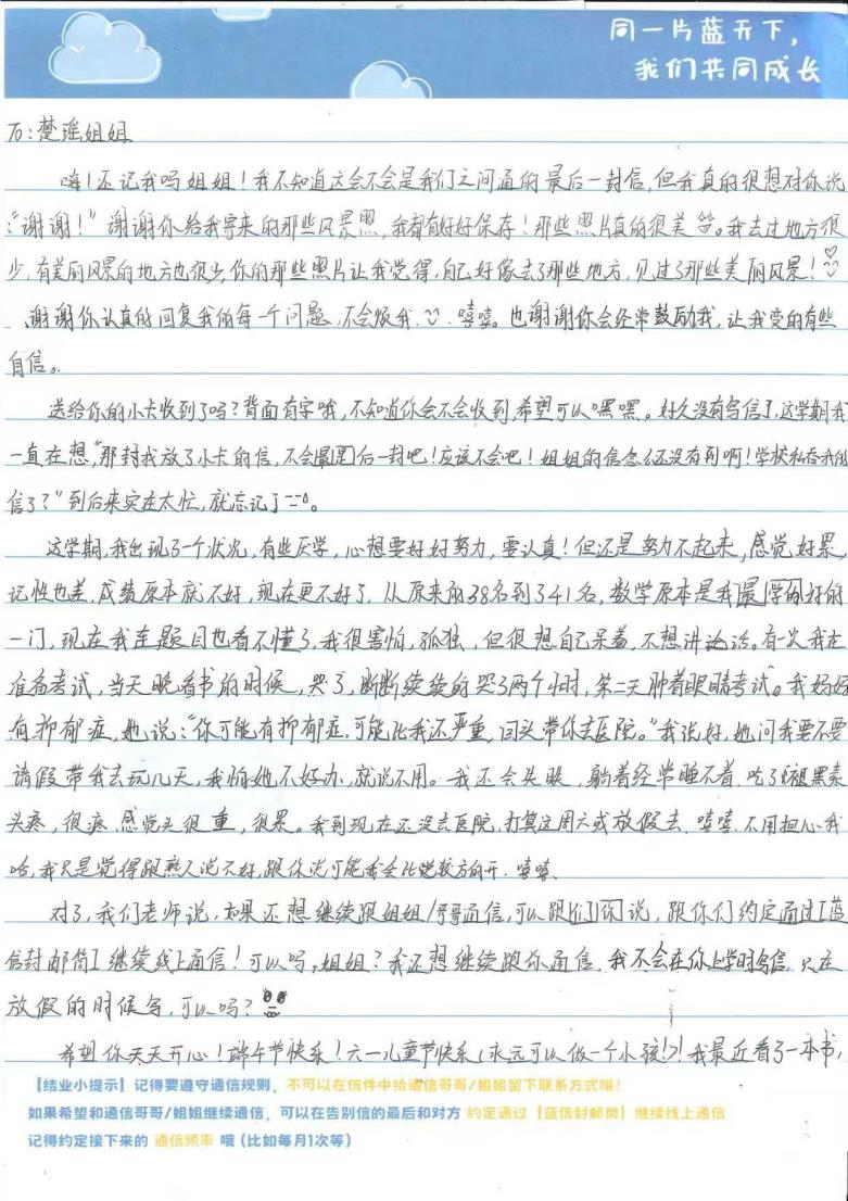 My own experience as a Blue Letter ambassador has been equally meaningful. I was paired with a girl named Zhao Wanqi. From the very beginning, our letters were filled with curiosity and trust. Zhao often shared with me her life in the countryside, her daily routines, and the things she dreamed of doing in the future. Over time, she started to confide more about her feelings—her worries about studies, her small joys with friends, and her thoughts about her family.