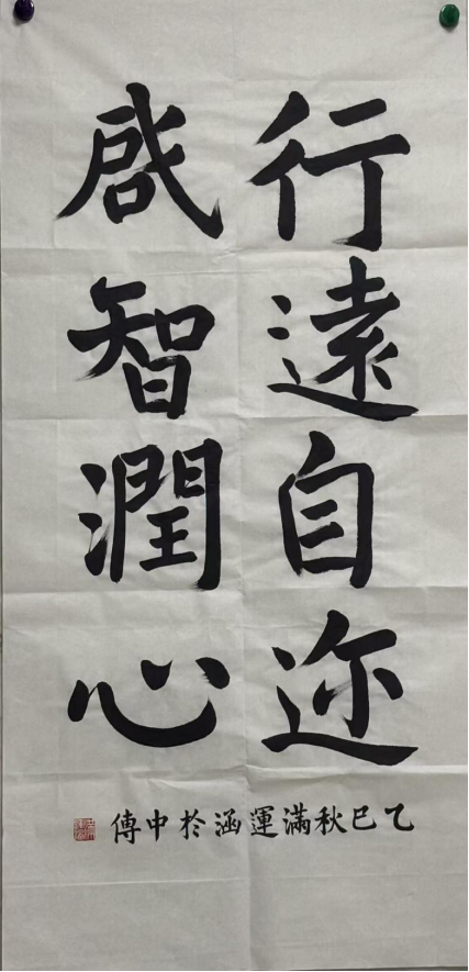 “Journey of a Thousand Miles Begins with a Single Step – Enlightening the Mind and Nurturing the Heart,” calligraphy by Man Yunhan, in Regular Script (Kaishu).