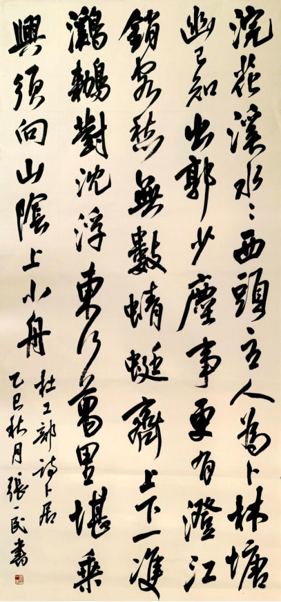 Du Fu’s poem “Choosing a Residence”, calligraphy by Zhang Yimin (Communication Engineering, Class of 2018), in Running Script (Xingshu).