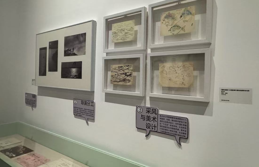 The display case for field research and art design showcases the wave and fish details from Nezha's Triumph Against the Dragon King (1979) at Animating the World: Era Memories and Contemporary Echoes of Shanghai Animation.