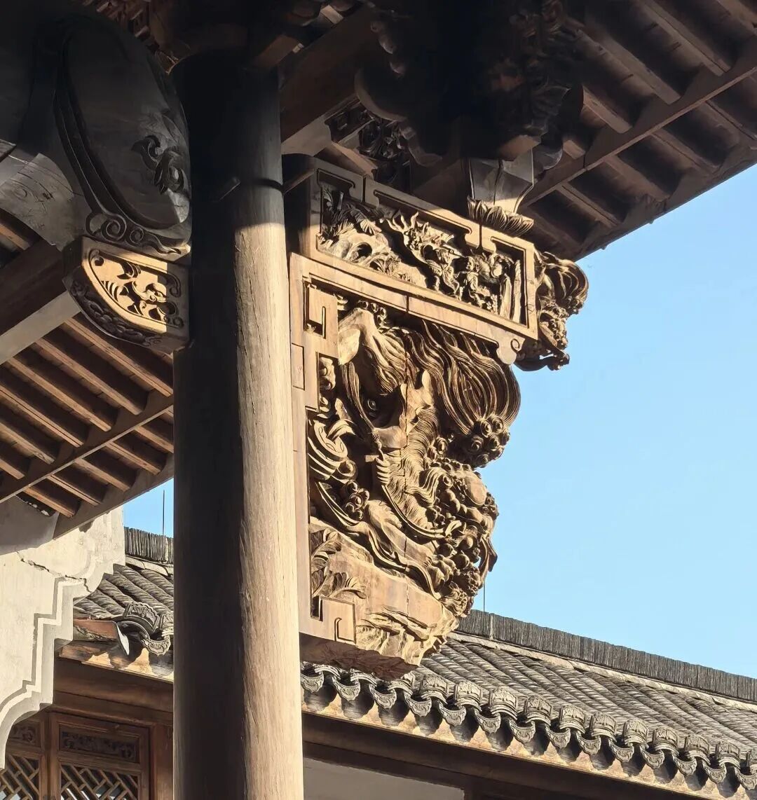 The main hall of this ancient Ming and Qing dynasty structure showcases a convergence of various carving techniques, including high relief, low relief, openwork carving, and sculpture in the round. The craftsmanship is deft and masterful, with vividly rendered scenes—flowers, birds, fish, insects, and human figures and stories—all springing to life from the wood. Within its intricately carved beams and painted rafters lies the pinnacle of Jiangnan classical architectural aesthetics, as well as the enduring craftsmanship passed down through generations by Dongyang artisans.