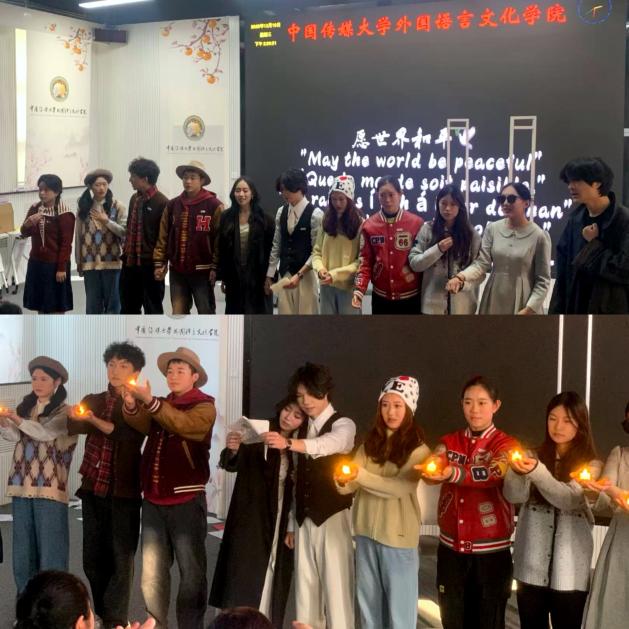 The First Prize winner, Who Shall Dwell by the Chinese-English Bilingual Broadcasting major, depicts a family making a sacrifice decision during a nuclear crisis. The parents in the family choose to shelter neighbors' children in their bunker together with their children at the cost of their own survival. Near the end of the drama, footage from current conflict zones appears on the screen. The cast then gathers with candles as the backdrop displays "May the worldbepeaceful" in multiple languages—an appeal for peace that resonates beyond language barriers.